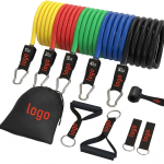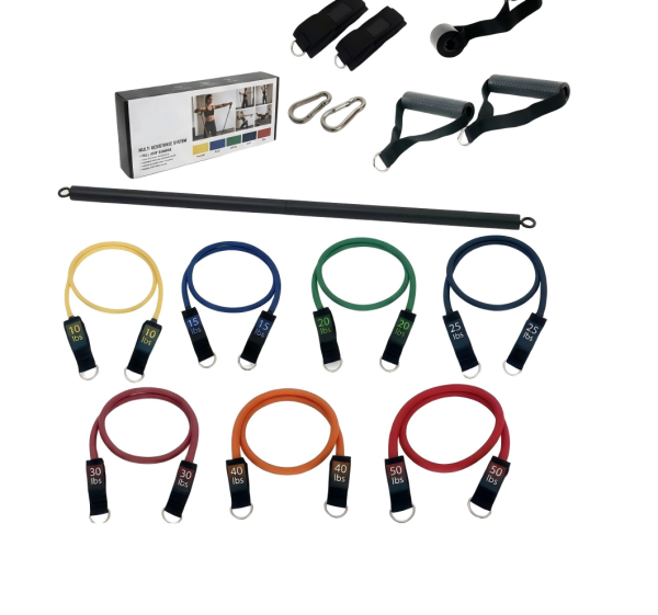 The system includes multiple resistance tubes ranging from light to heavy levels, allowing users to adjust intensity based on training goals.